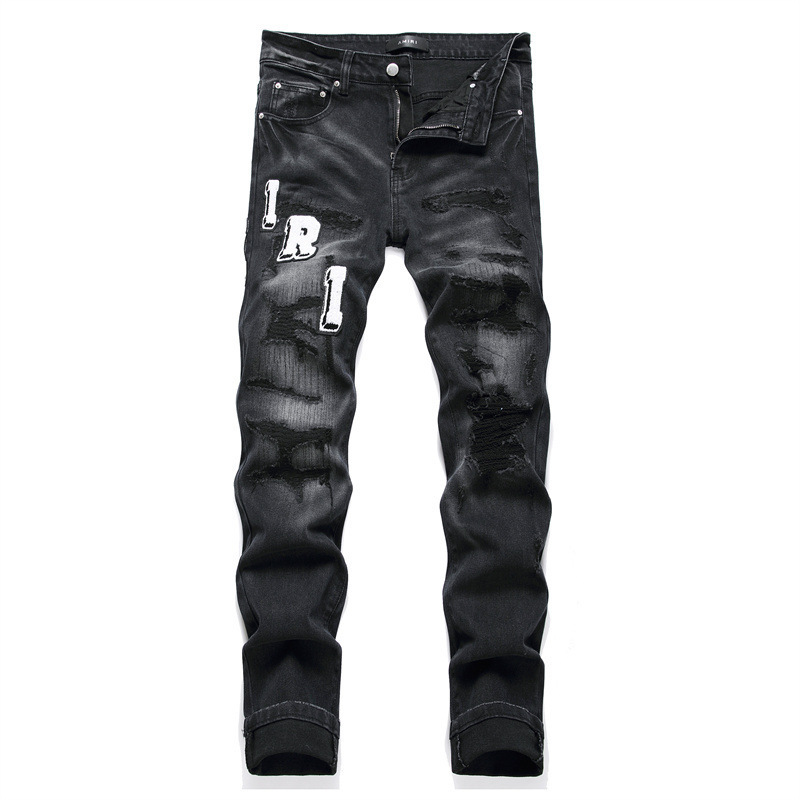 AM Jeans Retro Black Ripped Trendy Elastic Slim Fit Fashionable All-match Men's Pants