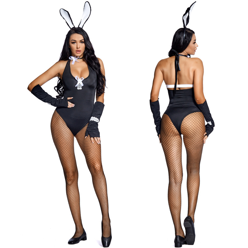 Bunny Girl Cosplay Halloween Role Play Costume Black Low-cut Deep V Fishnet Stockings Strap Jumpsuit