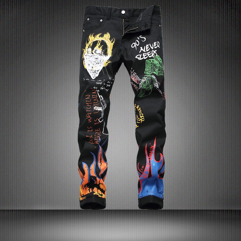 Casual Pants with Letter Prints, Black Non-elastic Slim Fit Floral Pants, Small Straight for Men