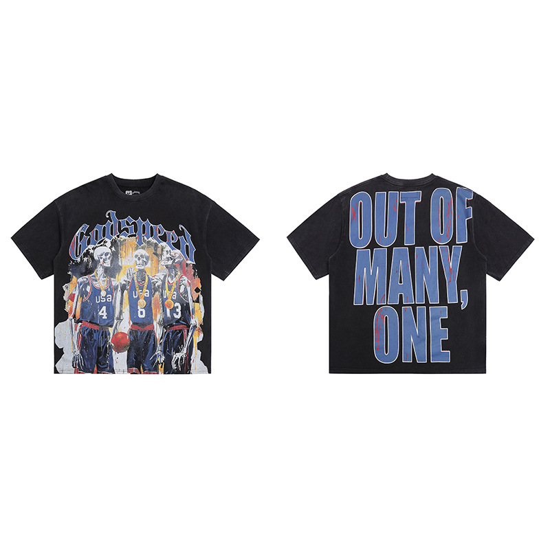 GOD SPEED Short-sleeved Letter Print Skull Washed and Distressed Loose T-shirt for Men and Women