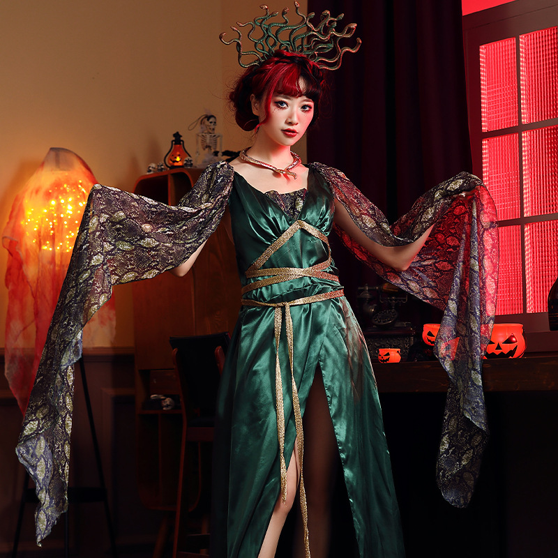 Medusa Long Dress Halloween Costume Greek Mythology Petrified Snake Head Siren Green with Headdress